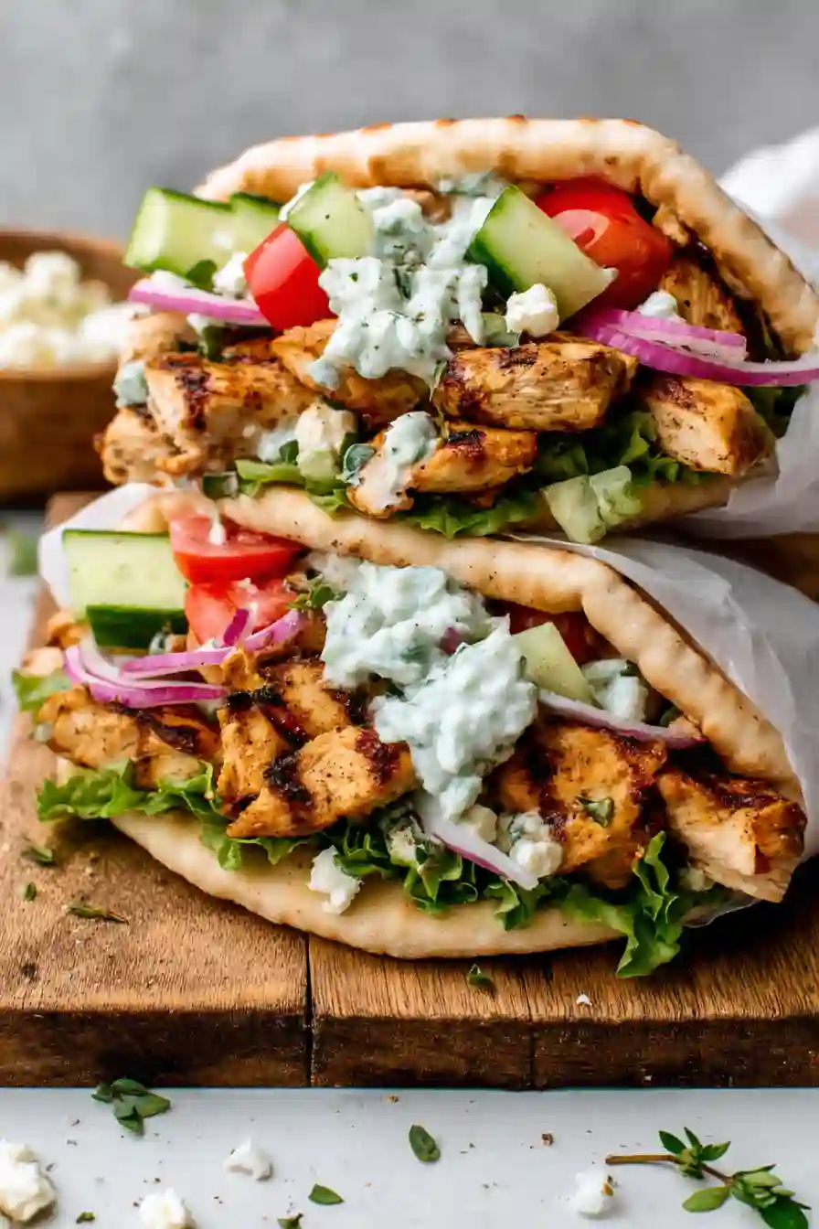 - Assemble: Warm pitas. Layer chicken, romaine, tomatoes, red onion, cucumber, and tzatziki. Add feta if desired and serve right away.