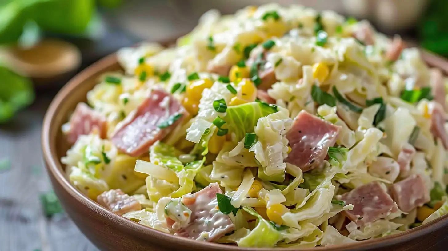 - In a large bowl, combine cabbage, cucumbers, corn, turkey ham, and scallions